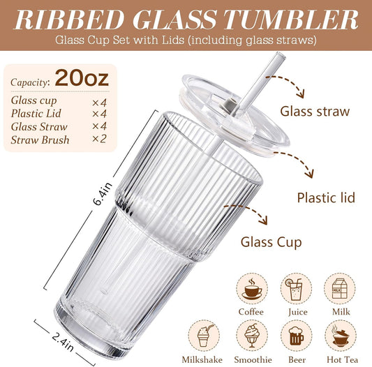 Iced Coffee Cups with Lids, 4Packs Ribbed Glass Tumbler with Straws and Lids, 20oz Leak Proof Tumbler Coffee Bar Accessories Reusable Glass Cups for To Go Iced Coffee