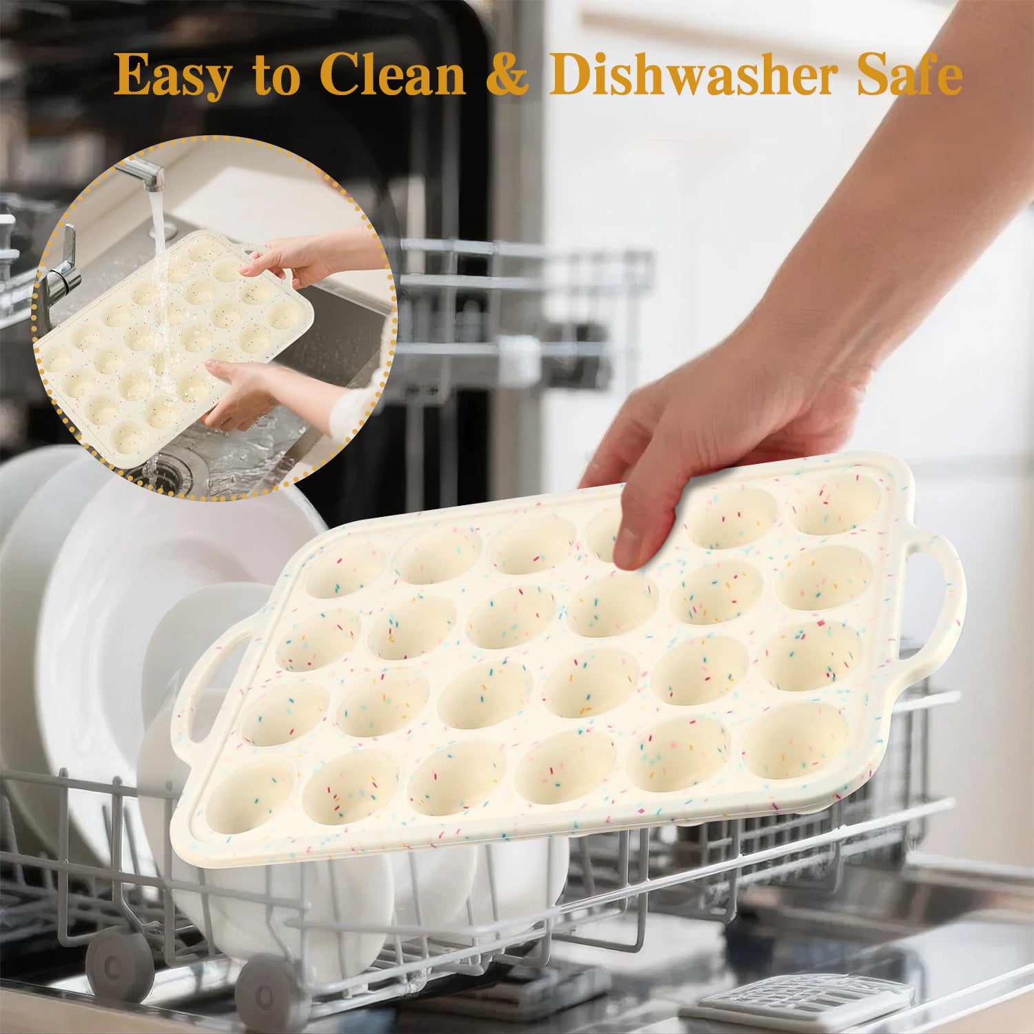 - Effortless Release Every Time: Our silicone muffin pans for baking features Nonstick & Polish surface, flexible silicone makes muffins pop out with pressed finger from bottom. It’s easy to clean thoroughly. Dishwasher Safe.