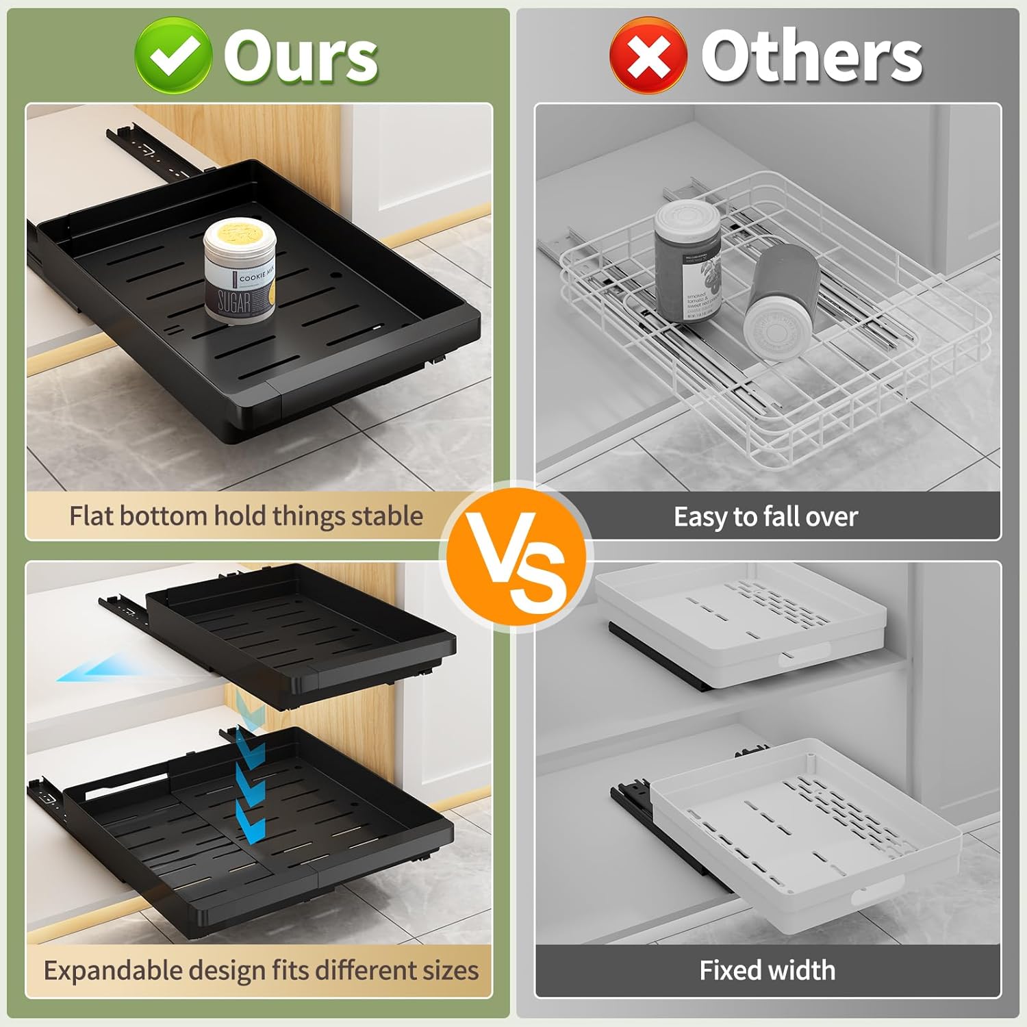 - Smooth Sliding: Our cabinet organizer features guide rails, which rigorously tested to withstand 40,000 open and close cycles. The pull-out cabinet shelf extends fully, allowing easy access and ensuring smooth, quiet operation. Ventilated Bottom design keeps the inside dry