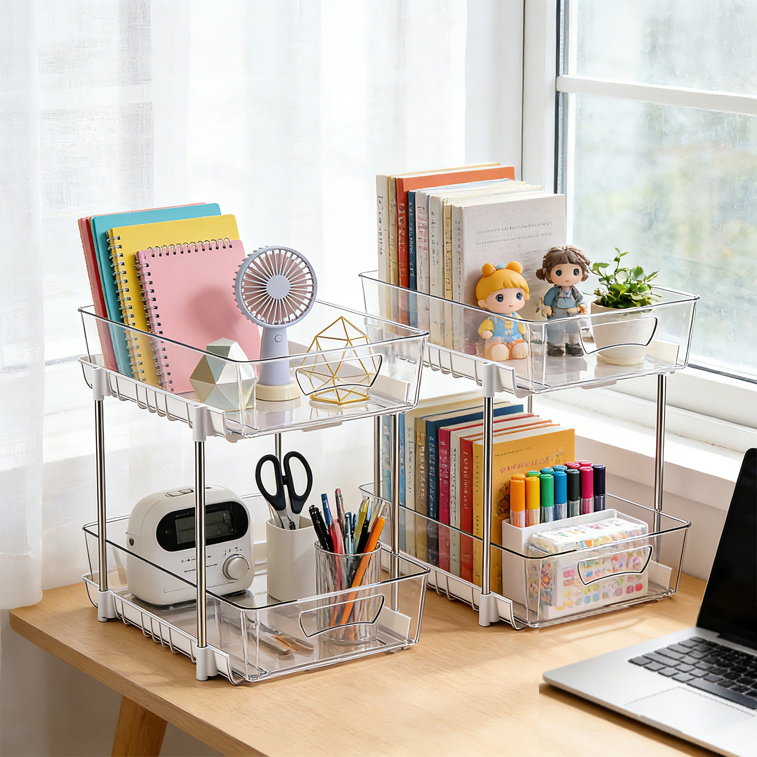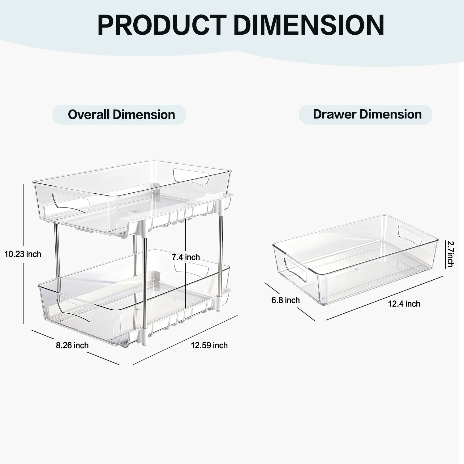 SLIDE-OUT DRAWER & STABLE STRUCTURE: This 2-tier storage organizer features two pull-out drawers with tracks to prevent swaying during use, and the built-in handle makes it easy to access hard-to-reach items. In addition, the bottom is equipped with 4 silicone non-slip pads to ensure stability when pulling the drawer out.